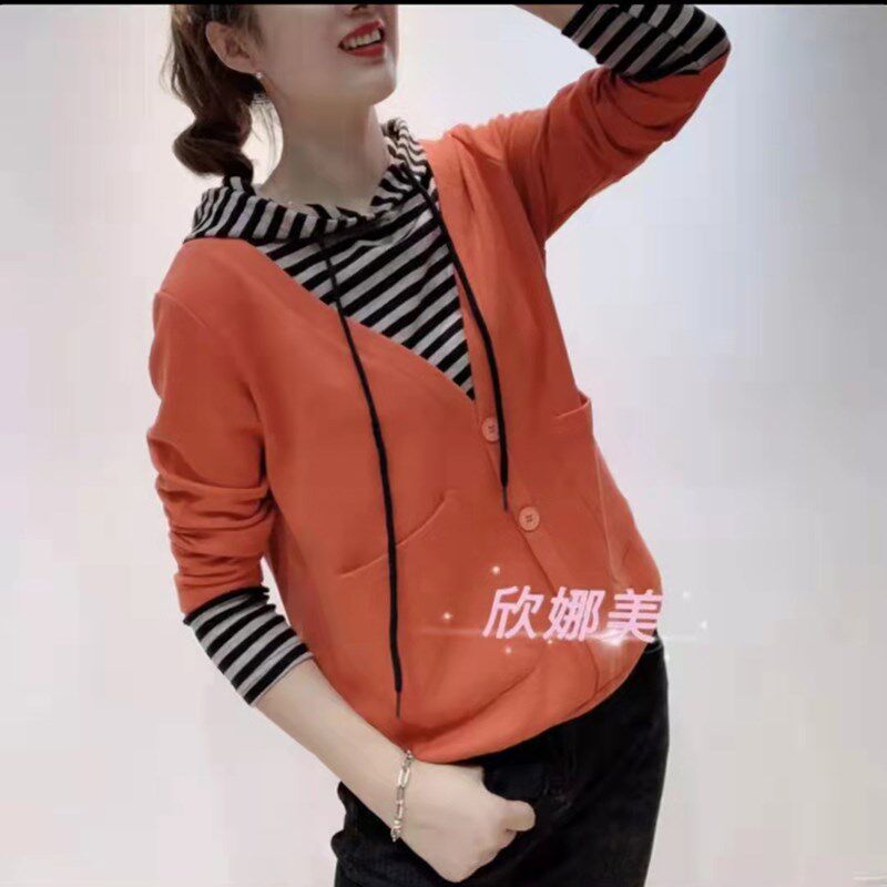 抖音裕阳服饰连帽卫衣条纹拼接假两件女2021秋季新款宽松打底上衣热门设计联盟服务商